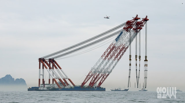 [포토] 세월호 침몰 현장, 해상크레인 투입