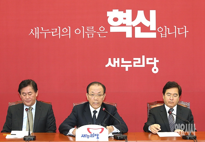 '세월호 참사'로 사회 전체적으로 분위기가 침체되어 있는 가운데 21일 오전, 서울 여의도 국회에서 열린 새누리당 최고위원회의에서 황우여 대표가 모두발언하고 있다.