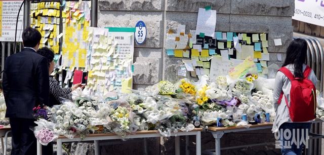 여객선 '세월호' 침몰 7일째를 맞고 있는 22일 안산 단원고등학교 정문에 희생자를 추모하고 실종자의 무사귀환을 기원하는 메시지가 담긴 쪽지와 꽃이 놓여 있다.