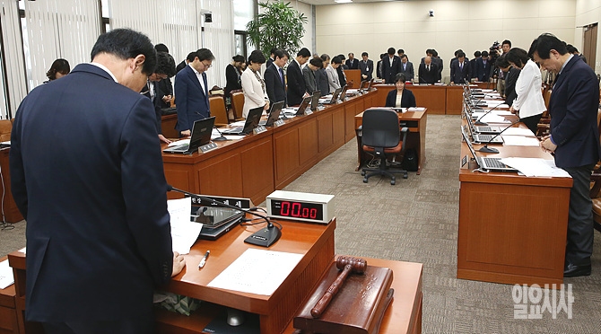 23일 오후, 국회 보건복지부위원회 전체회의 직전, 오제세 보건복지위원장(사진 왼쪽) 및 위원들이 서울 여의도 국회에서 열린 보건복지부 전체회의 직전, 세월호 참사 피해자들을 추모하며 잠시 묵념하고 있다.