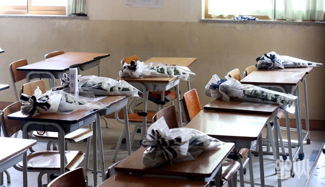 여객선 '세월호' 침몰 8일째를 맞고 있는 23일 경기도 안산 단원고 2학년 교실 책상에 희생자들의 영면을 기원하는 국화꽃이 놓여 있다.