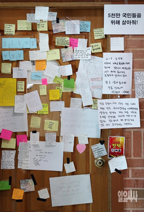 여객선 '세월호' 침몰 8일째를 맞고 있는 23일 경기도 안산 단원고 2학년 교실 벽면에 실종자들의 무사귀환을 기원하는 메모지가 붙여 있다.