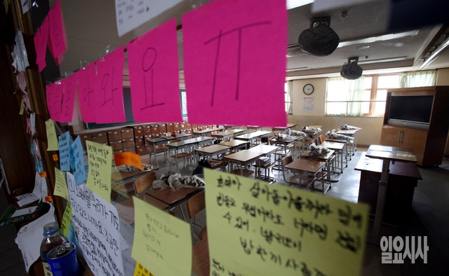 여객선 '세월호' 침몰 8일째를 맞고 있는 23일 경기도 안산 단원고 2학년 교실 벽면에 실종자들의 무사귀환을 기원하는 메모지가 붙여 있다.