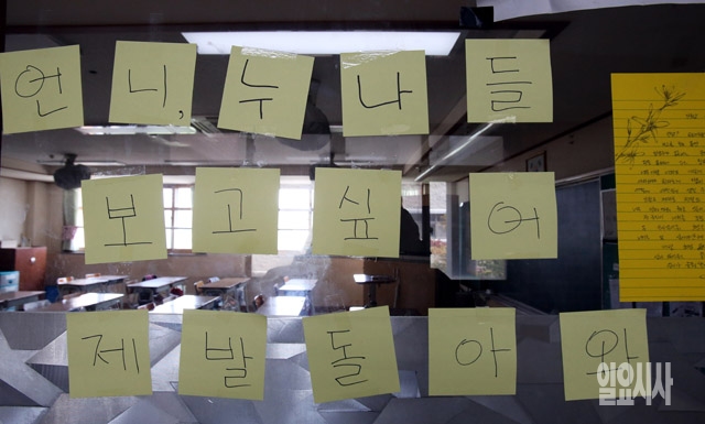 여객선 '세월호' 침몰 8일째를 맞고 있는 23일 경기도 안산 단원고 2학년 교실 벽면에 실종자들의 무사귀환을 기원하는 메모지가 붙여 있다.