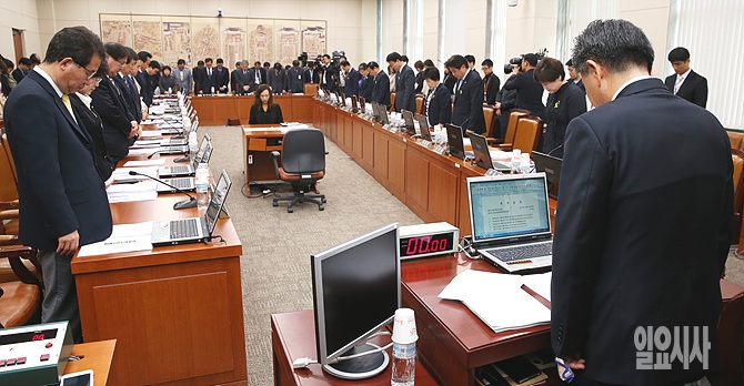 24일 오후, 유진룡 문화체육관광부 장관, 나승일 교육부 차관 등 참석자들이 서울 여의도 국회에서 열린 교육문화체육관광위원회 전체회의 직전, 세월호 참사 희생자와 유족들에 대해 묵념의 시간을 갖고 있다.