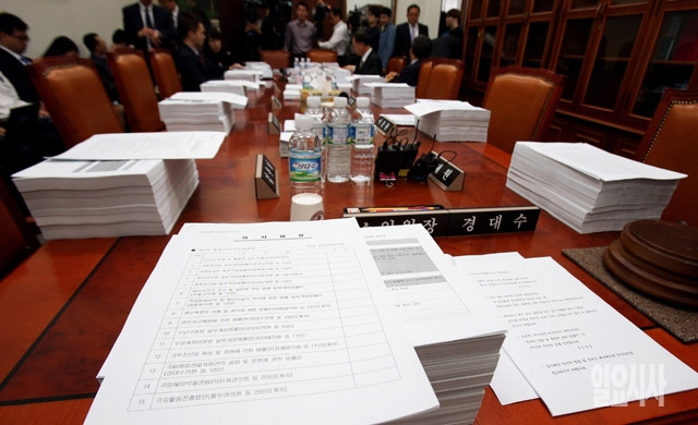 25일 서울 여의도 국회에서 열린 농림수산식품해양수산위원회 법률안심사소위에 앞서 책상 위에 법안심사 자료가 쌓여 있다.