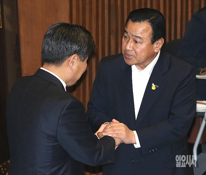 29일 오후, 서울 여의도 국회 본회의장에 출석한 새누리당 이완구 의원(사진 오른쪽)이 홍문종 사무총장과 악수하며 이야기를 나누고 있다.