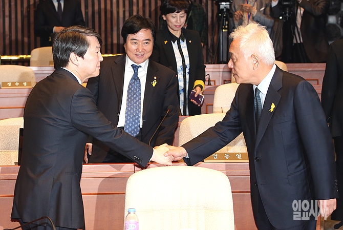 29일 오후, 서울 여의도 국회에서 열린 새정치민주연합 의원총회 직전, 김한길-안철수 공동대표가 악수를 나누고 있다.