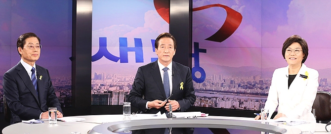 정몽준(사진 가운데)·김황식(사진 왼쪽)·이혜훈 새누리당 서울시장 예비후보들이 29일 오후, 서울 중구 매경미디어센터 MBN스튜디오에서 경선 후보 2차 토론회를 갖고 있다.