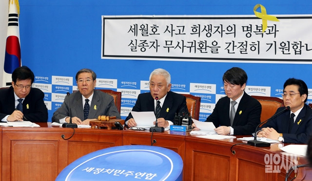 김한길 새정치민주연합 공동대표(가운데)가 30일 서울 여의도 국회에서 열린 최고위원 및 여객선침몰사고 대책위원장단 연석회의에서 모두발언을 하고 있다.