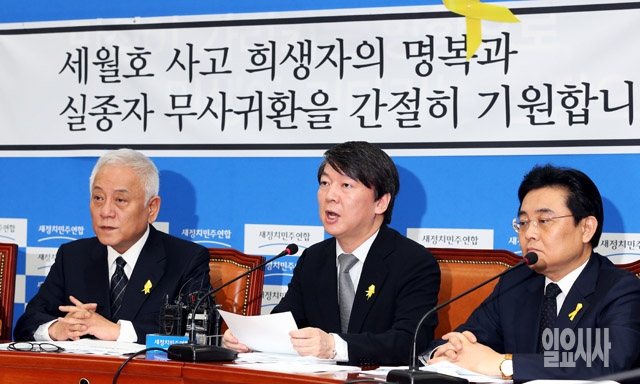 안철수 새정치민주연합 공동대표(가운데)가 30일 서울 여의도 국회에서 열린 최고위원 및 여객선침몰사고 대책위원장단 연석회의에서 모두발언을 하고 있다.