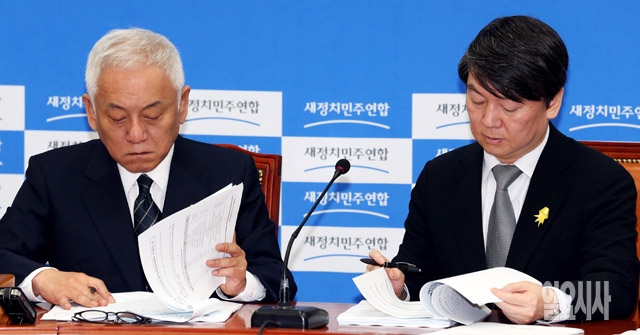 김한길(왼쪽), 안철수 새정치민주연합 공동대표가 30일 서울 여의도 국회에서 열린 최고위원 및 여객선침몰사고 대책위원장단 연석회의에서 자료를 살펴보고 있다.