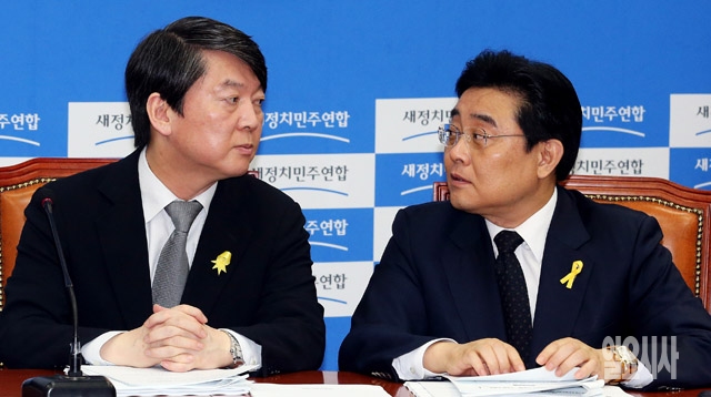 새정치민주연합 안철수 공동대표(왼쪽)와 전병헌 원내대표가 30일 서울 여의도 국회에서 열린 최고위원 및 여객선침몰사고 대책위원장단 연석회의에서 이야기를 나누고 있다.