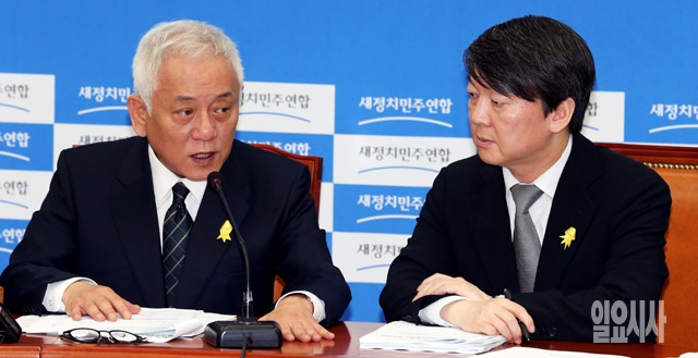 김한길(왼쪽), 안철수 새정치민주연합 공동대표가 30일 서울 여의도 국회에서 열린 최고위원 및 여객선침몰사고 대책위원장단 연석회의에서 이야기를 나누고 있다.