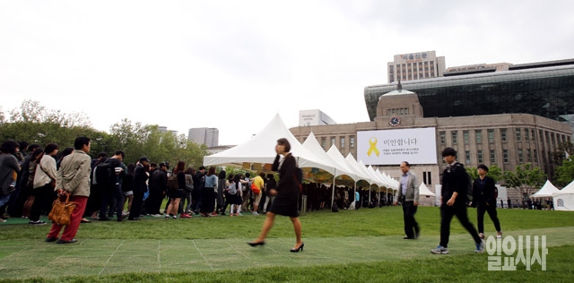 30일 세월호 희생자 합동분향소가 설치된 서울시청 앞 광장에 추모객들이 조문을 하기 위해 줄지어 서 있다.