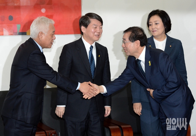 박원순 서울시장이 12일 서울 여의도 국회 새정치민주연합 당대표실에서 김한길·안철수 공동대표, 박영선 원내대표와 인사를 나누고 있다.