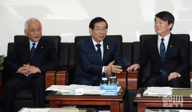 박원순 서울시장이 12일 서울 여의도 국회 새정치민주연합 당대표실에서 김한길·안철수 공동대표를 예방, 환담을 나누고 있다.