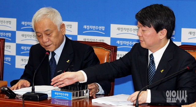안철수 새정치민주연합 공동대표(오른쪽)가 12일 서울 여의도 국회에서 열린 최고위원 및 여객선침몰사고 대책위원장단 연석회의에서 모두발언을 하고 있다.
