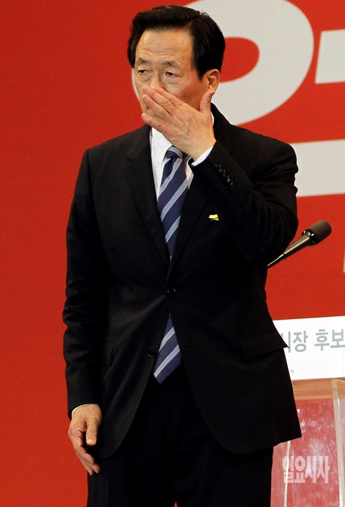 2014 전국동시지방선거 새누리당 서울시장 후보자로 선출된 정몽준 의원이 12일 서울 방이동 올림픽공원 체조경기장에서 당선자 수락 연설을 마친 뒤 눈물을 닦고 있다.