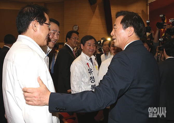 13일 오후, 서울 여의도 국회 의원회관에서 열린 6·4지방선거 중앙선거대책위원회 발대식에 정몽준 서울시장 후보가 홍준표 경남도지사 후보와 이야기를 나누고 있다.