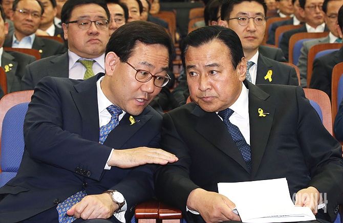 14일 오후, 서울 여의도 국회에서 열린 새누리당 의원총회에서 이완구 원내대표와 주호영 정책위의장이 이야기를 나누고 있다.