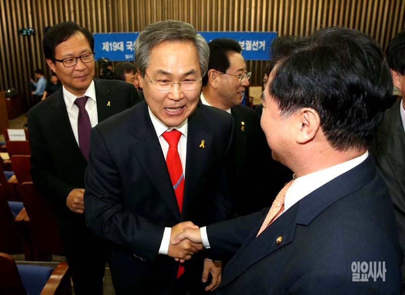 새정치민주연합 원내대표 보궐선거를 위한 의원총회가 열린 9일 오후 서울 여의도 국회 246호실에서 원내대표에 선출된 우윤근 의원이 의원들과 인사를 하고 있다