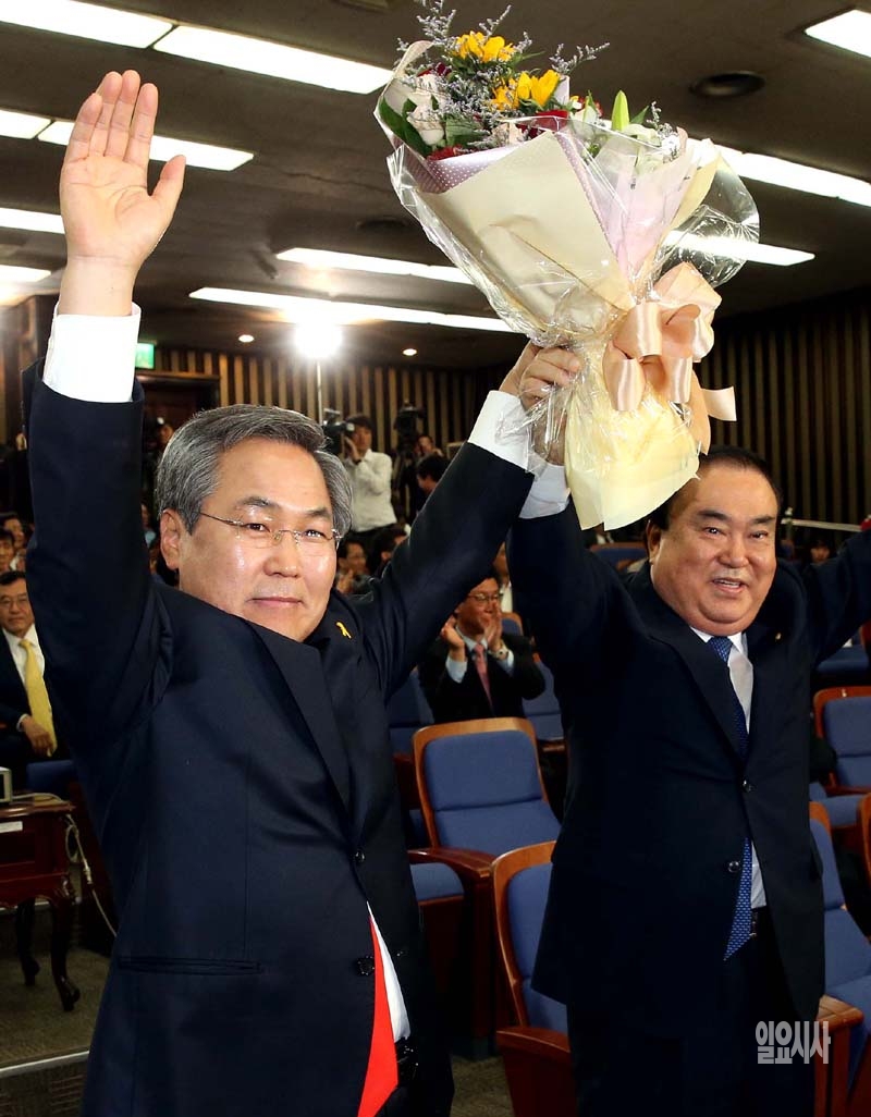 새정치민주연합 원내대표 보궐선거를 위한 의원총회가 열린 9일 오후 서울 여의도 국회 246호실에서 문희상비대위원장이 원내대표에 선출된 우윤근 의원과  인사를 하고 있다