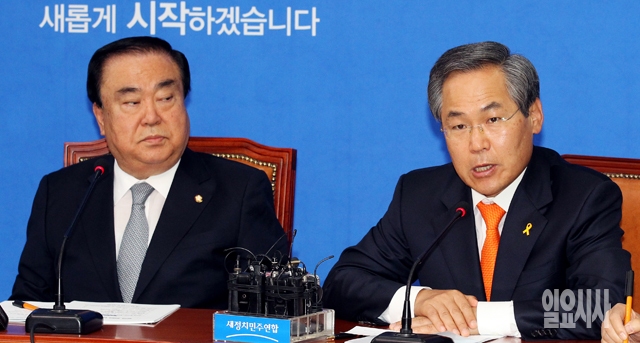 새정치민주연합 우윤근 신임 원내대표(오른쪽)가 10일 서울 여의도 국회에서 열린 비상대책위원회의에서 모두발언을 하고 있다.