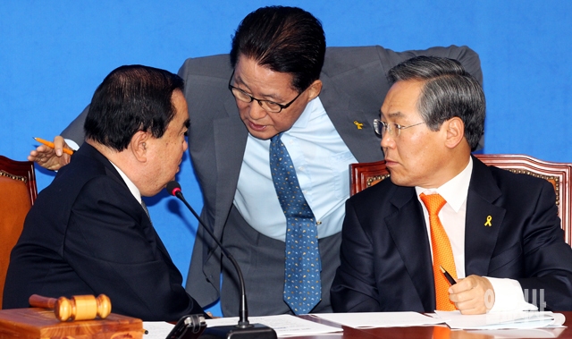 새정치민주연합 문희상 비상대책위원장(왼쪽부터), 박지원 비대위원, 신임 우윤근 원내대표가 10일 서울 여의도 국회에서 열린 비상대책위원회의에서 논의를 하고 있다.