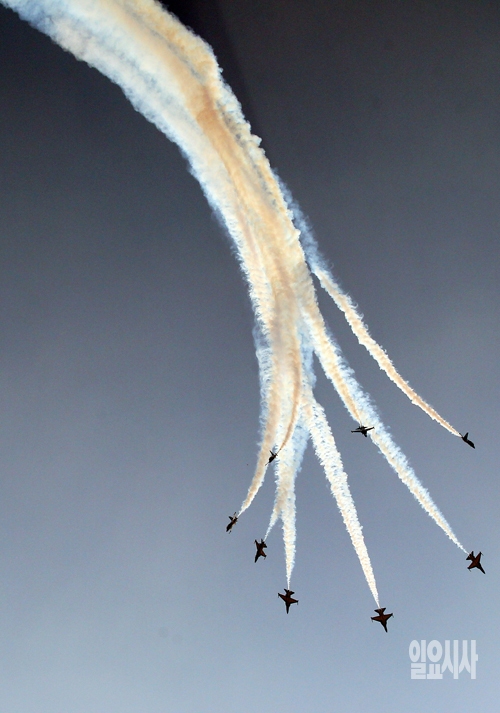 10일 경기도 수원공군기지에서 열린 '공군과 함께하는 2014경기항공전'에서 공군 특수비행팀 '블랙이글'이 에어쇼를 선보이고 있다.