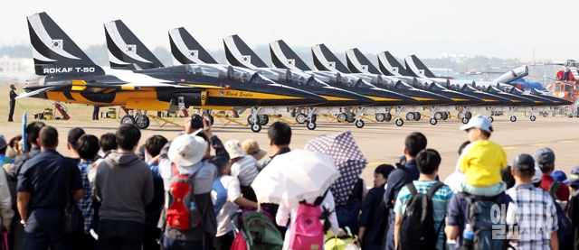10일 경기도 수원공군기지에서 열린 '공군과 함께하는 2014경기항공전'에서 공군 특수비행팀 '블랙이글'이 에어쇼를 선보이기 위해 출격을 앞두고 있다.