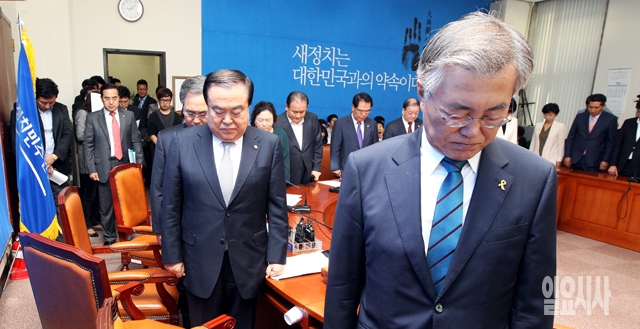 새정치민주연합 문희상 비상대책위원장을 비롯한 참석자들이 10일 서울 여의도 국회에서 열린 당무위원회의에서 묵념을 하고 있다.