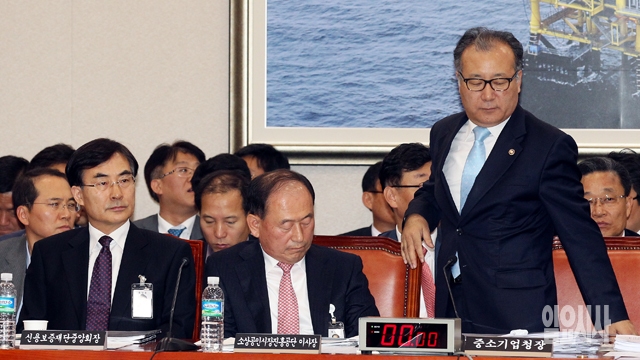 한정화 중소기업청장이 10일 서울 여의도 국회에서 열린 산업통상자원위원회의 국정감사에서 업무보고를 마친 뒤 자리에 앉고 있다.