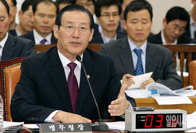 박창명 병무청장이 10일 서울 여의도 국회에서 열린 국방위원회의 병무청 국정감사에서 의원들의 질의에 답하고 있다.