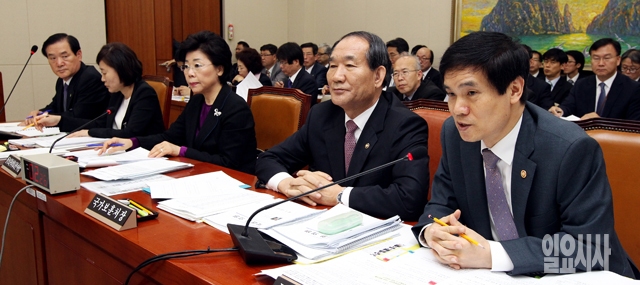 이성보 국민권익위원장(맨 오른쪽)이 10일 서울 여의도 국회에서 열린 정무위원회의 국정감사에서 의원들의 질의에 답하고 있다. 오른쪽부터 이성보 국민권익위원장, 박승춘 국가보훈처장, 김옥이 한국보훈복지의료공단 이사장, 윤주경 독립기념관장, 김종해 88관광개발 사장.
