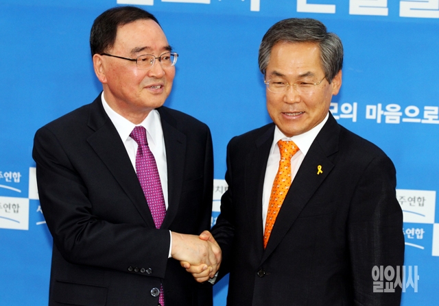 정홍원 국무총리(왼쪽)가 13일 서울 여의도 국회에서 새정치민주연합 우윤근 원내대표를 찾아 인사를 나누고 있다.