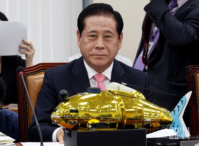새누리당 배덕광 의원이 13일 서울 여의도 국회에서 열린 미래창조과학방송통신위원회의 국정감사에서 '로봇물고기'를 준비해 놓고 질의를 기다리고 있다.