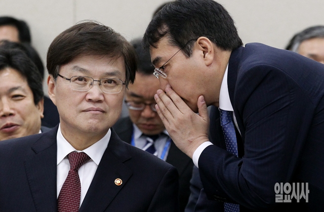 최양희 미래창조과학부장관(왼쪽)이 13일 서울 여의도 국회에서 열린 미래창조과학방송통신위원회의 국정감사에서 이석준 제1차관에게 보고를 받고 있다.