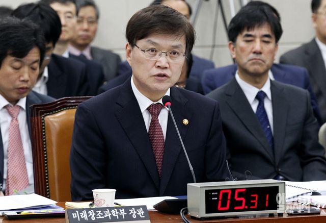 최양희 미래창조과학부장관이 13일 서울 여의도 국회에서 열린 미래창조과학방송통신위원회의 국정감사에서 의원들의 질의에 답하고 있다.