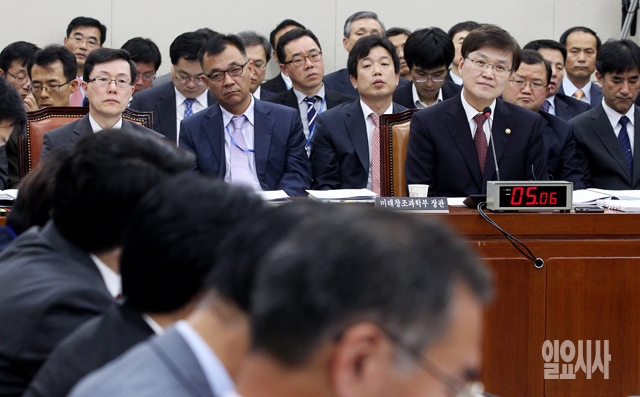 최양희 미래창조과학부장관을 비롯한 참석자들이 13일 서울 여의도 국회에서 열린 미래창조과학방송통신위원회의 국정감사에서 의원들의 질의를 경청하고 있다.