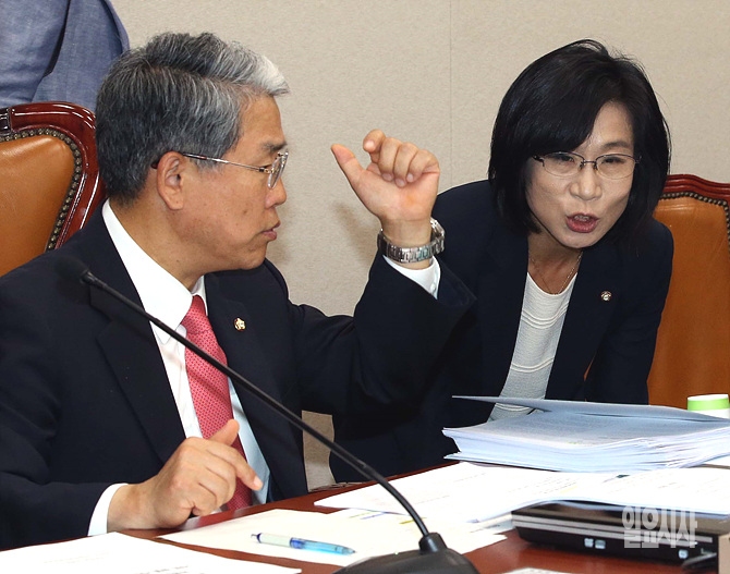 13일 오전, 서울 여의도 국회 산업통상자원위원회 회의실에서 열린 국정감사 도중 김동철 새정치민주연합 의원과 김제남 정의당 의원이 이야기를 나누고 있다.