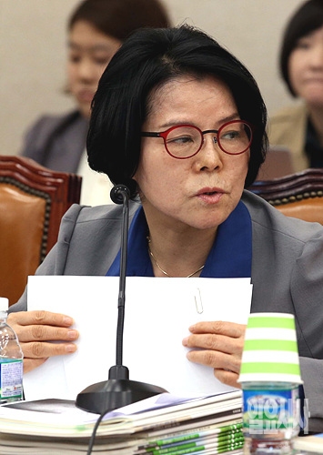 13일 오전, 서울 여의도 국회 산업통상자원위원회 회의실에서 열린 국정감사에서 새정치민주연합 전순옥 의원이 윤상직 산자부장관에게 질의하고 있다.