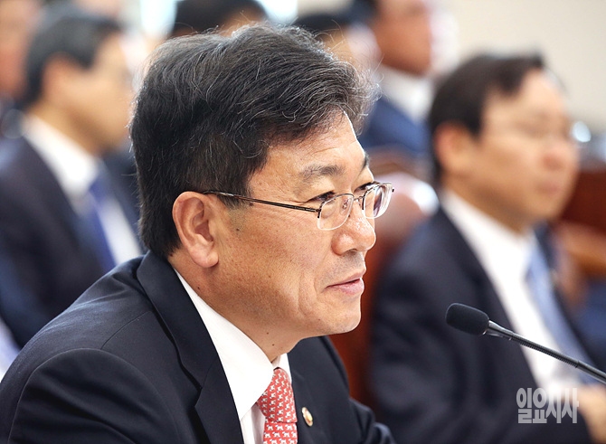 13일, 서울 여의도 국회 산업자원통상부 회의실에서 열린 2014 산자부 국정감사 도중 윤상직 산자부장관이 잠시 웃음 짓고 있다.