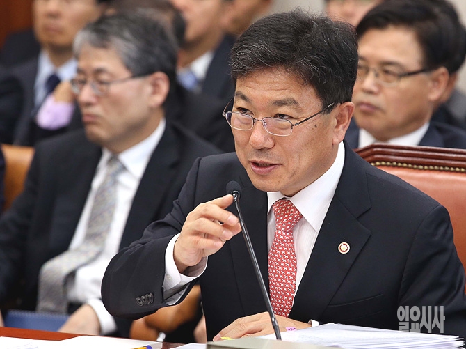 13일, 서울 여의도 국회 산업자원통상부 회의실에서 열린 2014 산자부 국정감사에서 윤상직 장관이 의원들의 질의에 답변하고 있다.