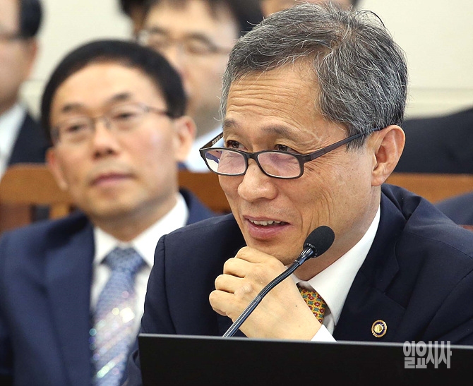 13일, 서울 여의도 국회 기획재정위원회 회의실에서 열린 2014 기재위 국정감사에서 김상규 조달청장이 의원들이 질의 도중 웃음 짓고 있다.