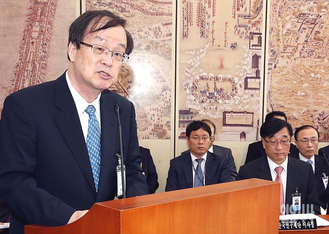 13일, 서울 여의도 국회 교육문화관광체육위원회 회의실에서 열린 2014 교문위 국정감사 직전, 김학준 동북아역사재단 이사장이 인사말을 하고 있다.
