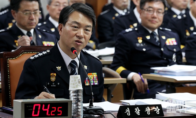 강신명 경찰청장이 13일 서울 미근동 경찰청에서 열린 국회 안전행정위원회의 경찰청 국정감사에서 의원들의 질의에 답하고 있다.
