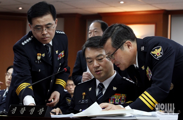 강신명 경찰청장(가운데)이 13일 서울 미근동 경찰청에서 열린 국회 안전행정위원회의 경찰청 국정감사에서 관계자에게 보고를 받고 있다.