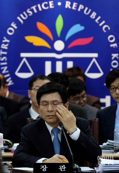 황교안 법무부 장관이 13일 경기 정부과천청사에서 열린 국회 법제사법위원회의 국정감사에서 의원들의 질의를 경청하고 있다.