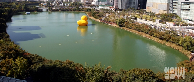 14일 서울 송파구 석촌호수에 거대 고무오리 '러버덕' 떠 있다. 러버덕은 네덜란드 예술가 플로렌타인 호프만이 만든 노란색 고무 오리인형으로 지난 2007년부터 프랑스 생나제르, 네덜란드 암스테르담, 일본 오사카, 호주 시드니, 브라질 상파울로 등 14개 도시를 돌아다니며 평화와 행복의 메시지를 전했다. 내달 14일까지 한국 서울 석촌호수에 전시될 예정이다.